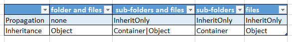 As you can see we need to define the $access, the $rights and a constellation for $inheritance and $propagation. The first 2 inputs are trivial as you can see. For the last two variables i have made a little table to simplify the conditions. Whether you want different objects (files/folders) or a different depth to be get applied by this rule you have to enter a different constellation for both variables: